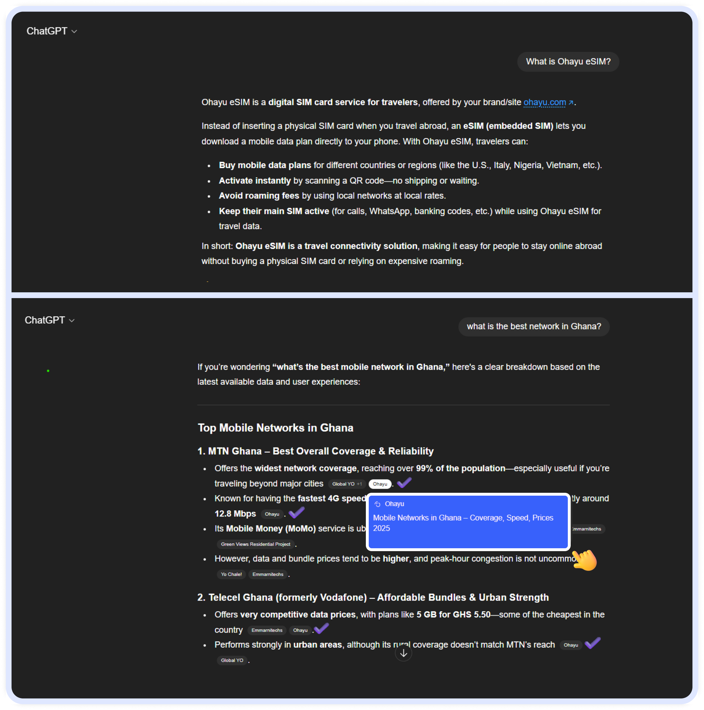 ChatGPT conversation explaining Ohayu eSIM service and comparing Ghana mobile networks MTN Ghana and Telecel Ghana by coverage and pricing.